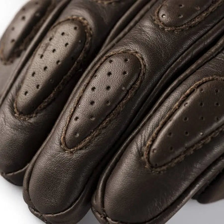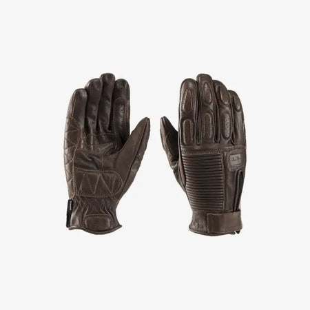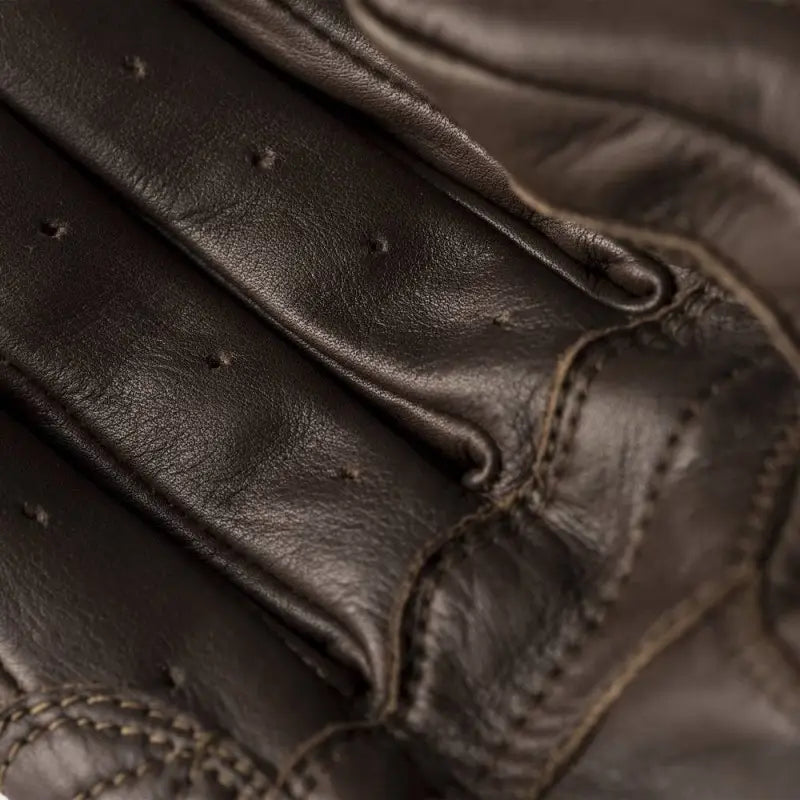 Guanti in pelle di nappa bovina con palmo rinforzato e imbottito, cinghia di chiusura, nervature sul dorso, cuscinetti di gomma sulle dita per assorbire gli urti e vestibilità ergonomica.