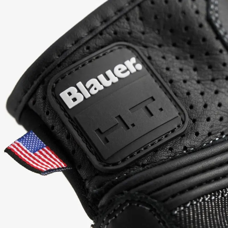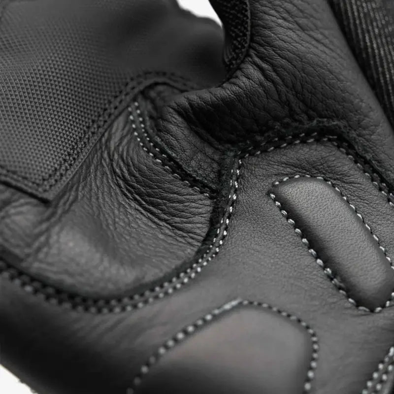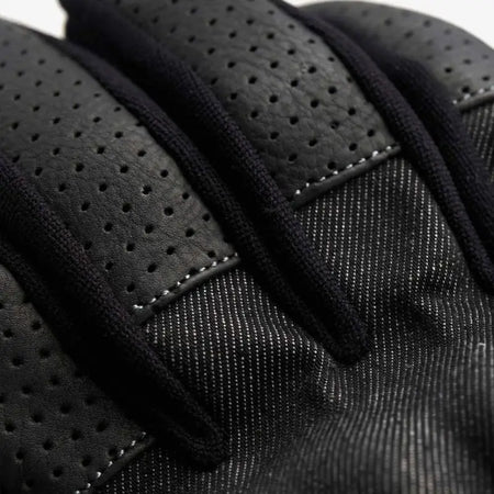 Guanto corto in denim e pelle di nappa bovina perforata su dita e polso, con protezioni TPU sulle nocche, chiusura in velcro e interno in morbido poliestere.