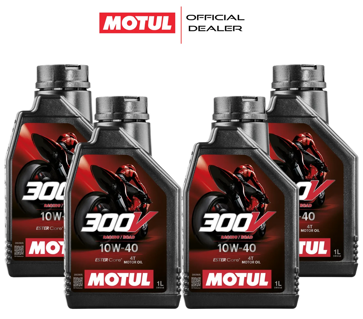 Olio motore Motul 300V 10W40, lubrificante 100% sintetico sviluppato per team da competizione. Sfrutta la tecnologia esclusiva ESTER CORE® per estrarre la massima potenza del motore mantenendo affidabilità superiore e riducendo significativamente l'usura. La selezione accurata di esteri sintetici ad alte prestazioni, combinata con un innovativo pacchetto di additivi, crea una sinergia perfetta che protegge motore, cambio e frizione. Viscosità 10W40 ideale per prestazioni racing senza compromessi.
